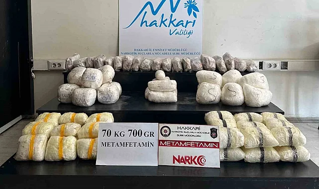 Hakkari Valiliği'nden yapılan açıklamada, "İl Emniyet Müdürlüğümüz görevlilerince uyuşturucu veya uyarıcı madde ticaretinin önlenmesine ve batı illerine sevkiyatını engellemeye yönelik olarak çalışmalar aralıksız devam ediyor. Yapılan çalışmalarda Yüksekova ilçemizde durumundan şüphelenilen bir otomobilde arama yapılmış, araçtan 83 parça halinde toplamda 70 kilogram 700 gram kristal halde metamfetamin maddesi ele geçirilmiştir. Olayla ilgili olarak 2 şahıs hakkında yasal işlem başlatılmıştır" denildi.